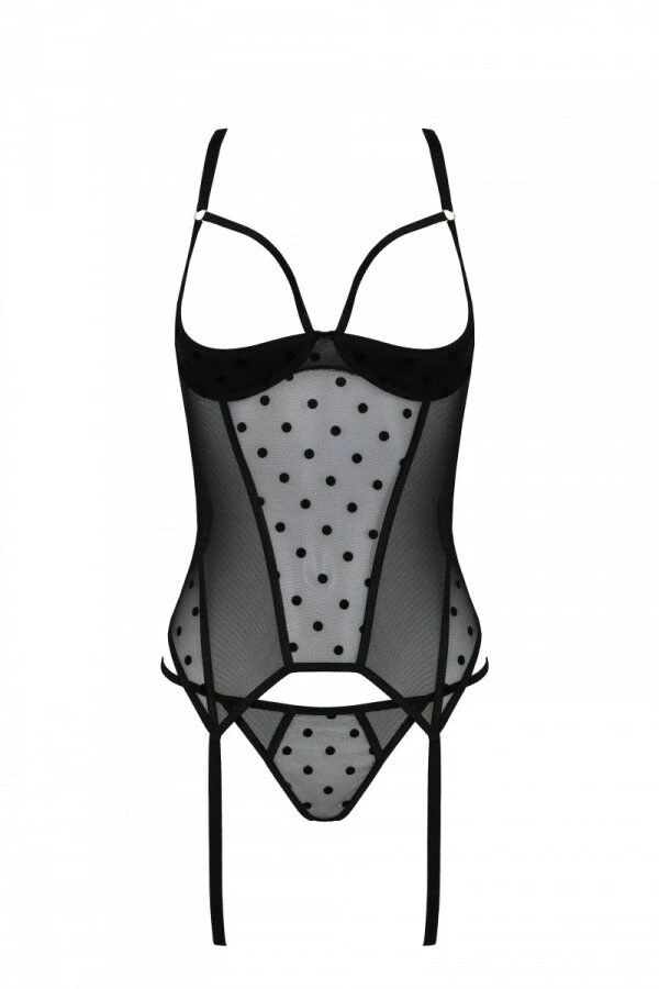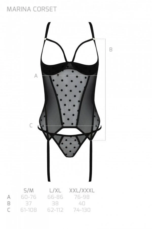 Корсет виготовлений з чорної м’якої прозорої сіточки. Бігунки на бретелях допомагають відрегулювати білизну за розміром. Корсет Passion MARINA CORSET можна одягати разом із панчохами — для цього є акуратні неширокі кріплення. У наборі до корсета йдуть маленькі стрінги з чорної в горошок сіточки.