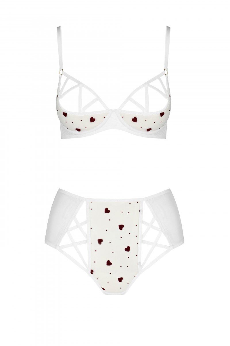 Неймовірно романтична білизна з трендовими високими трусиками! Пропонуємо купити еротичний комплект з малюнком LOVELIA BIKINI white L/XL - Passion: трусики з високою посадкою і напіввідкритою попкою плюс бюстгальтер на кісточках з жорсткою получашкою. Така конструкція білизни підкреслює талію, високо піднімає груди і створює хвилюючу лінію декольте. Ніжні сердечка додатково прикрашають білизну.