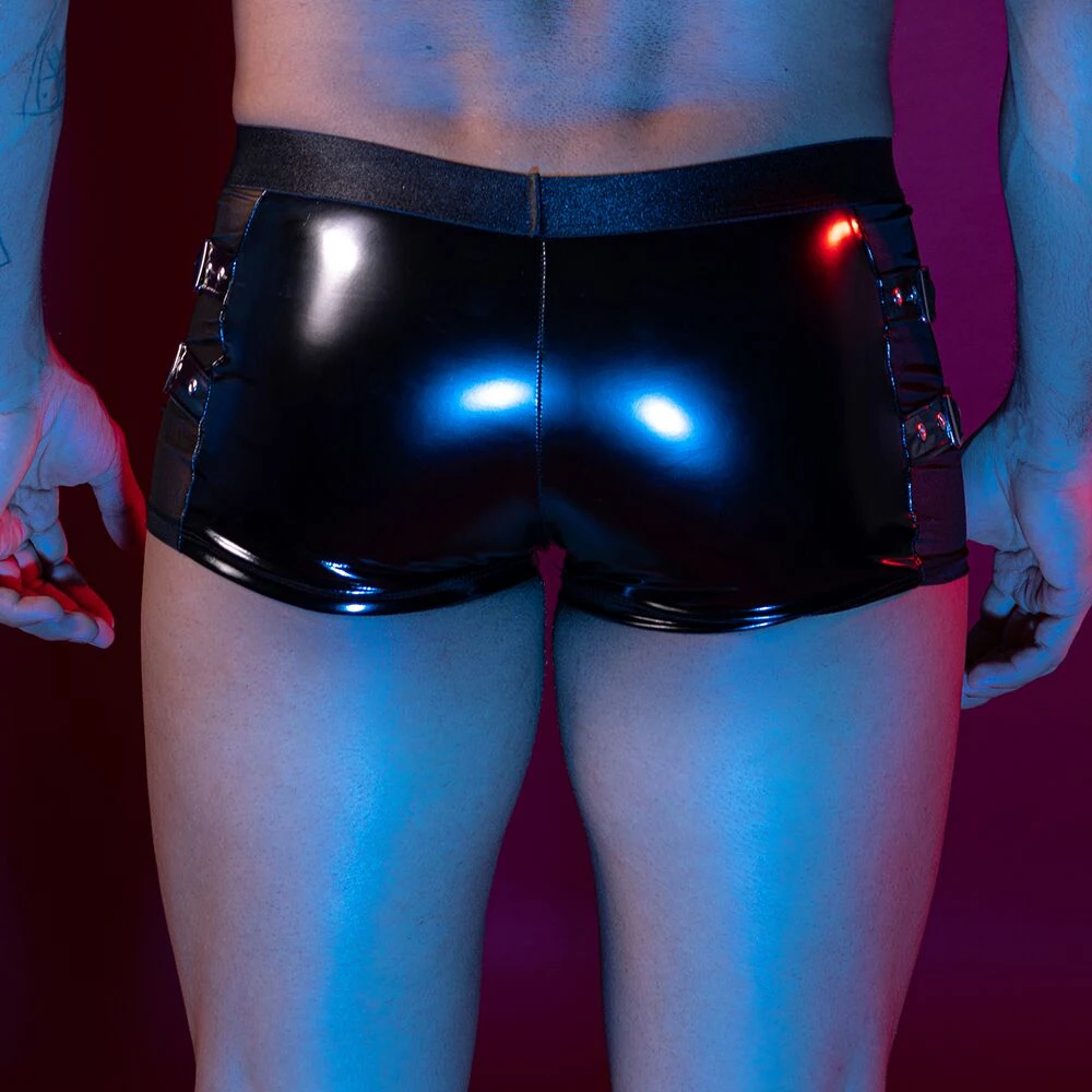 JSY 9120T — це зухвала та футуристична модель чоловічих трусів-боксерів, яка поєднує глянцевий блиск вінілу з агресивними декоративними елементами.