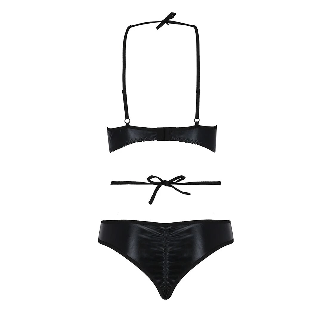 Комплект від Passion поєднує мереживні та латексні вставки, створюючи цікавий контраст та унікальний стиль. Мереживо додає нотку ніжності, водночас як латекс надає сексуальності та зухвалості. Чашки бюстгальтера чудово підтримують груди завдяки кісточкам, регульованим бретелям і багатоступеневій застібці ззаду. Декоративний елемент — це зав’язка на шиї, яка сама просить, щоб її акуратно розв’язали. Трусики мають низьку посадку, з драпіруванням ззаду. Від них відходять ремінці, які підкреслюють талію.