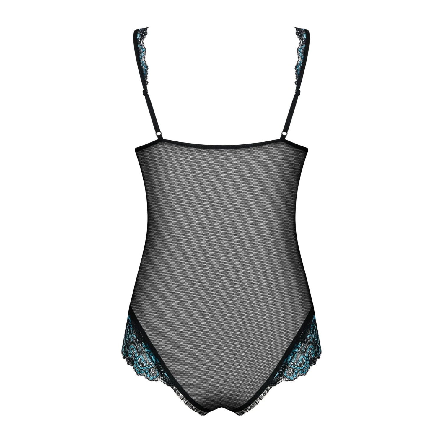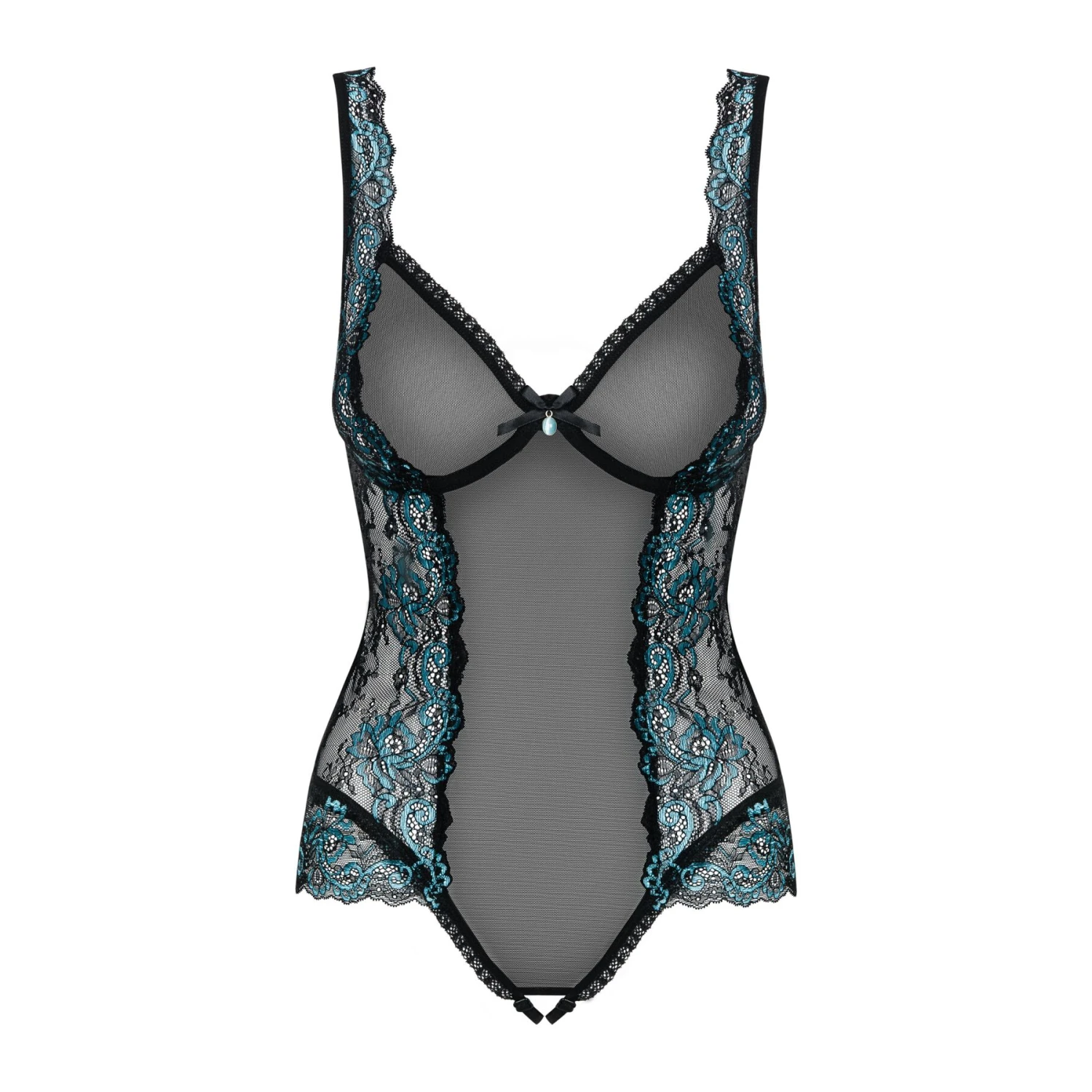 У чашки ліфа дуже вдало вшиті кісточки — це дає змогу підтримати і гарно окреслити груди. Прикрашені мереживом регульовані бретелі можна відкоригувати по довжині для більшої зручності та кращого прилягання. Кулон-прикраса між грудьми притягує погляд і ніби просить торкнутися та пестити. Широкі вставки з шикарного мережива з боків візуально роблять силует стрункішим. Чорний колір майстерно сплітається з ніжно-блакитним, підкреслюючи та виділяючи витончений малюнок вишуканого мережива. Найтонша ніжна сіточка лягає на тіло, еротично його прикриваючи, але залишаючи можливість розглянути всі пікантні деталі і особливо неоднозначний натяк на відкритий промежину з регульованими еластичними ремінцями.