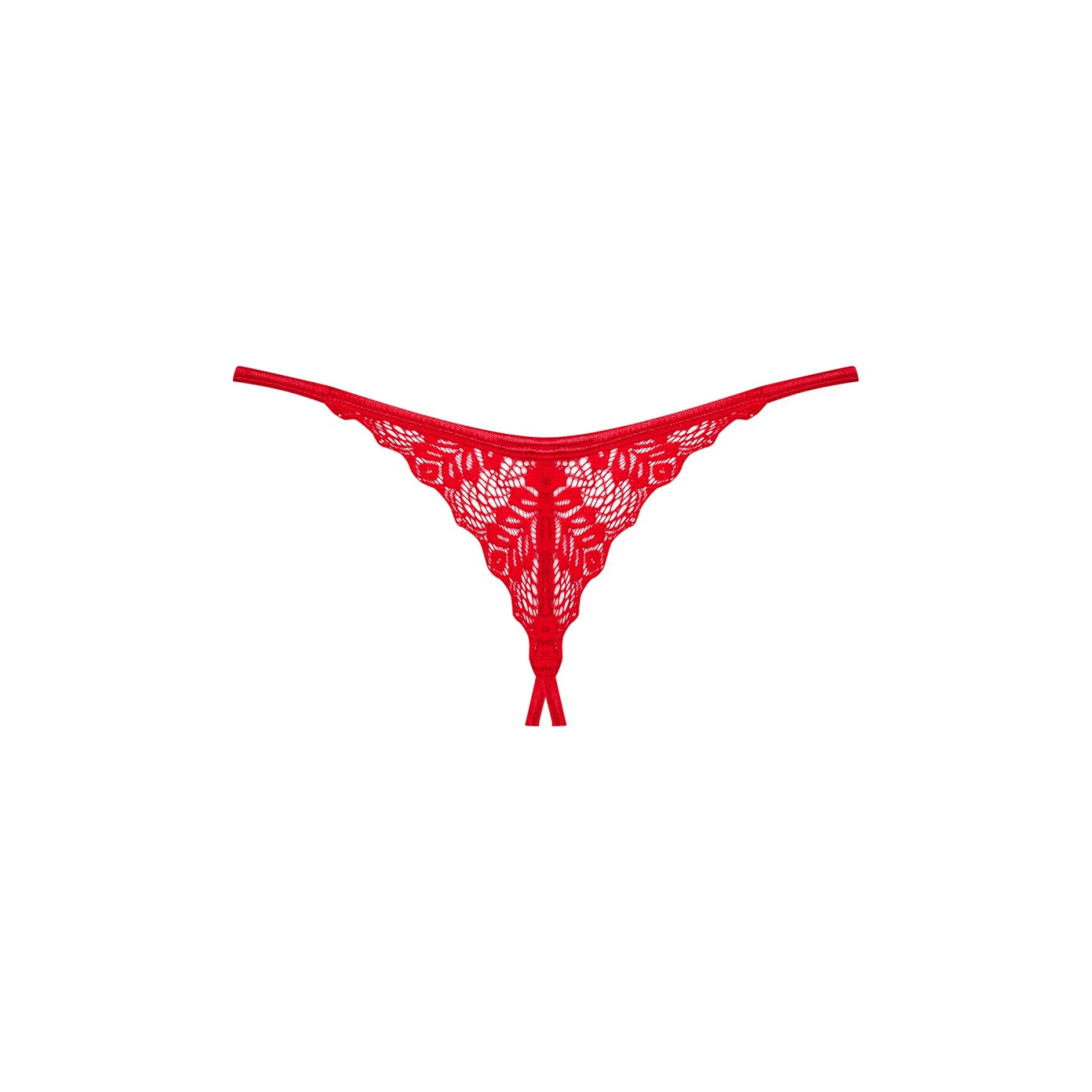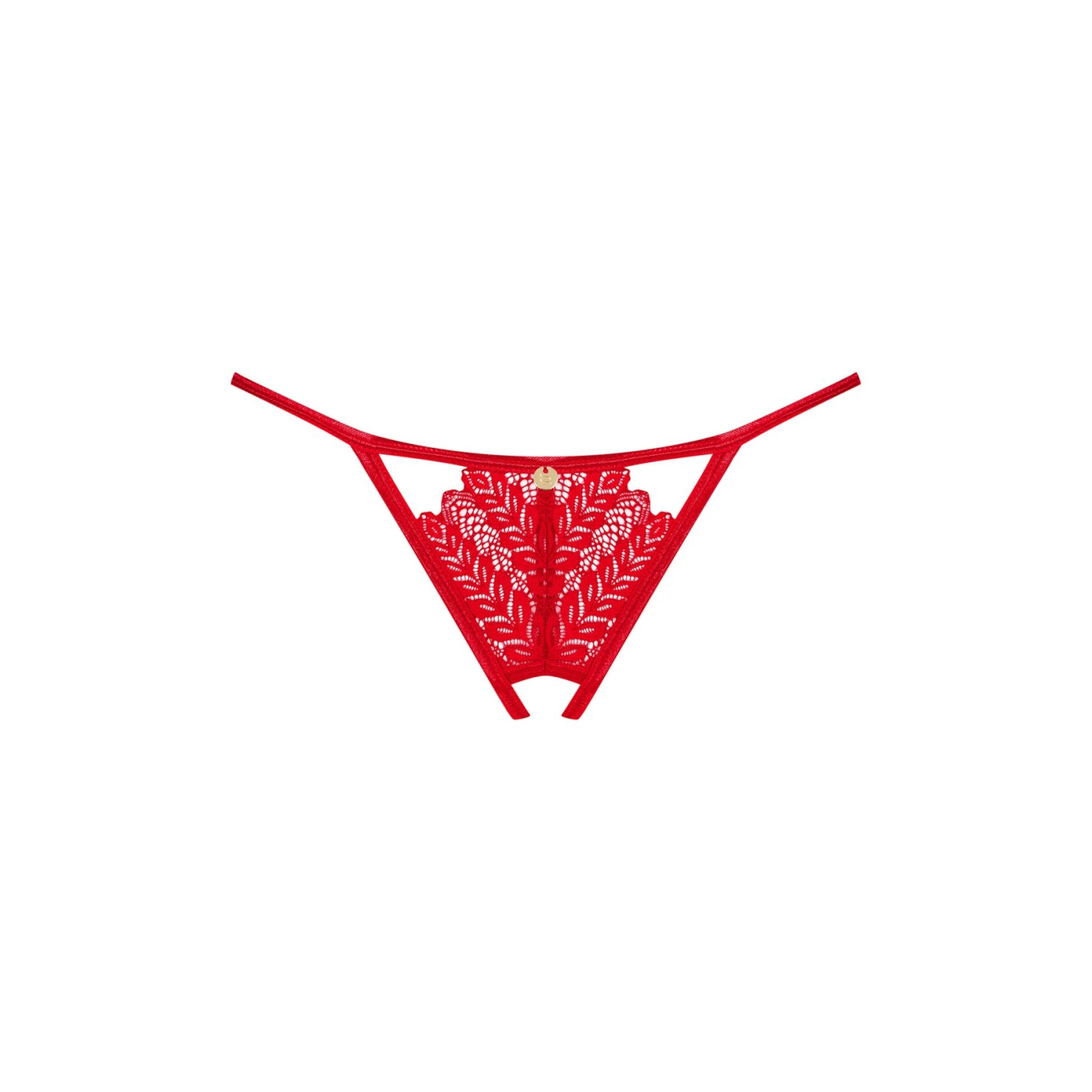 Трусики пошиті із тонких еластичних стрепів червоного кольору. Передня та задня частини виконані з сіточки з листяною вишивкою. Маленький золотистий кулончик із логотипом виробника привертає погляд до низької посадки стрінгів. Відкрита промежина — головний нюанс: симпатична білизна може залишатися на вас до та під час інтимних ігор.