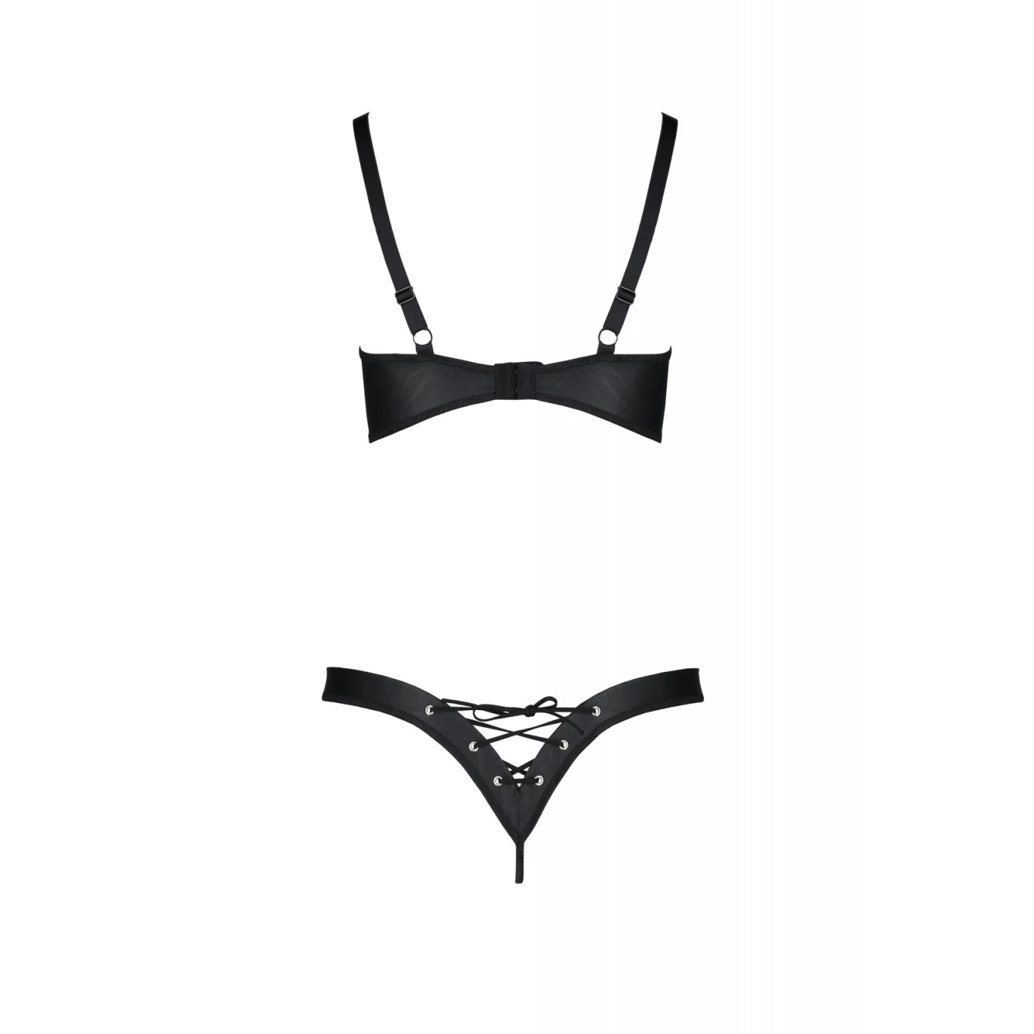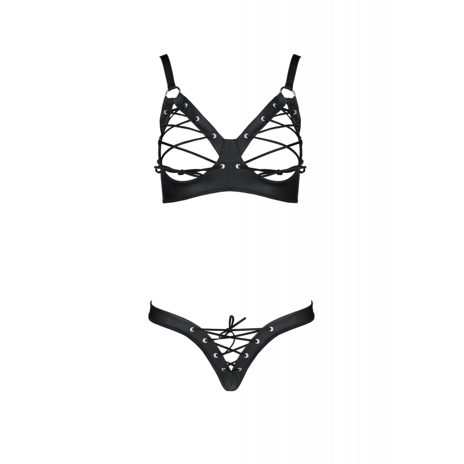 Еротичний комплект з екошкіри Celine Bikini black S/M — Passion, ідеально сідає по фігурі, підкреслюючи всі спокусливі форми. Ліф із трикутними вирізами на чашках підкреслює природний контур грудей. Прикрашений шнурками зі щільного матеріалу, металевими кільцями та люверсами, топ ідеально адаптується до жіночих вигинів. Регульовані бретелі забезпечують ідеальну посадку та комфорт. Мінімалістичні стрінги гарно окреслюють лінію сідниць, роблячи їх ще більш привабливими. Декор трусиків повністю повторює декор ліфа та створює гармонійний дует. Таке еротичне вбрання можна носити під звичайним одягом, а можна доповнити панчохами та туфлями на високих підборах, щоб додати пристрасті в романтичний вечір. Таке вбрання підійде для БДСМ-сесій, а в поєднанні з панчохами та туфлями на високих підборах додасть пристрасті в романтичний вечір.