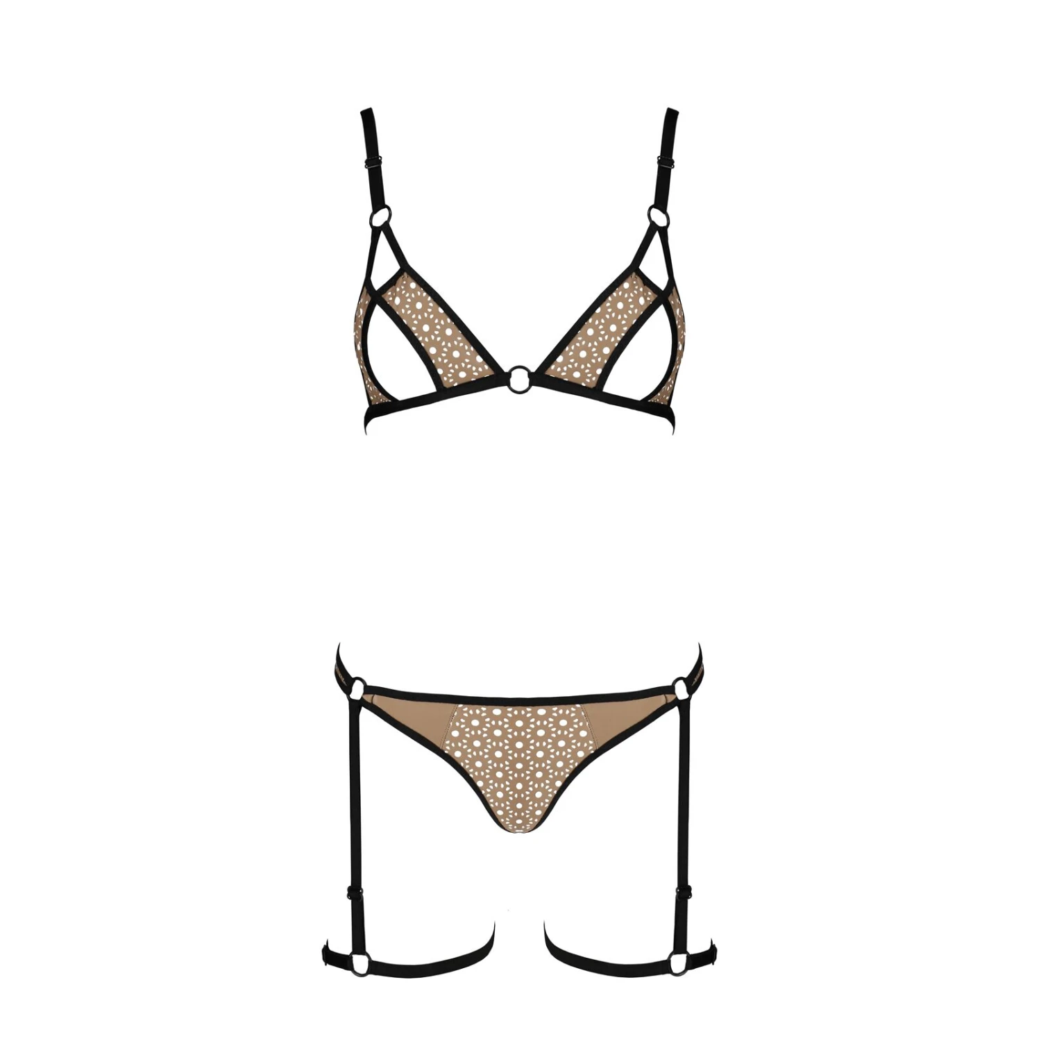 Пропонуємо купити сексуальний комплект спідньої білизни GABI SET, створений польським брендом Passion. Надзвичайно приємна на дотик тканина бежевого кольору обшита тонкими бретельками чорного кольору. Комплект білизни запропонований у розмірі S/M.