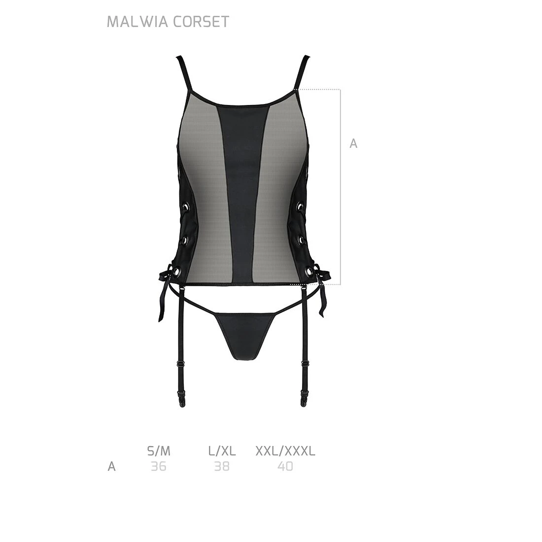 Купіть сітчастий корсет з екошкіри, з люверсами та знімними пажами Malwia Corset black XXL/XXXL — Passion — ідеальне вбрання, що запрошує до найнепристойніших ігор.