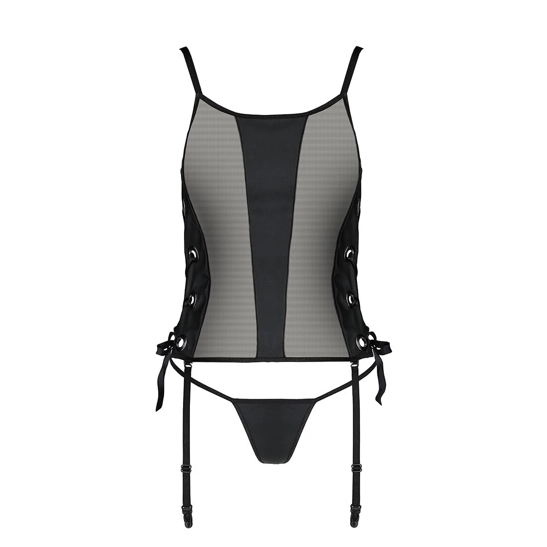 Сітчастий корсет з екошкіри, з люверсами та знімними пажами Malwia Corset black XXL/XXXL — Passion — безпрограшний коктейль із сітки, металу та шкіри, що здатен розтопити будь-який лід та вивільнити невичерпну енергію пристрасті. Напівпрозора тканина створює ефект чохла на шкірі, а широкі вертикальні вставки візуально роблять фігуру більш стрункою. Металеві кільця одночасно слугують прикрасою та спеціальними петлями для стрічок-зав’язок. У комплекті йдуть відповідні стрінги, щоб вбрання мало завершений вигляд. Такий зухвалий ансамбль, доповнений панчохами та туфлями на підборах, може стати сексуальним вбранням для вечора вдвох та ідеальним способом ще раз підкорити обранця. Підв’язки для панчіх можна легко зняти.