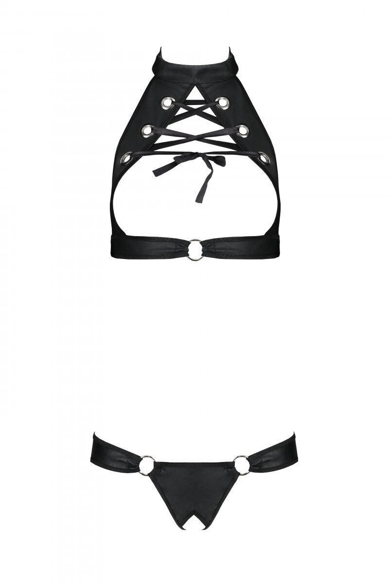 Комплект: відкритий топ та трусики з екошкіри з люверсами Malwia Set with Open Bra black L/XL — Passion:
