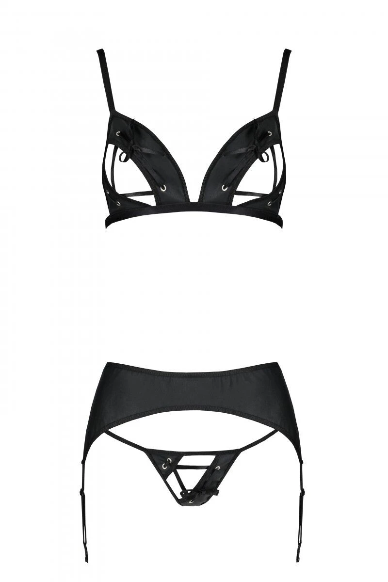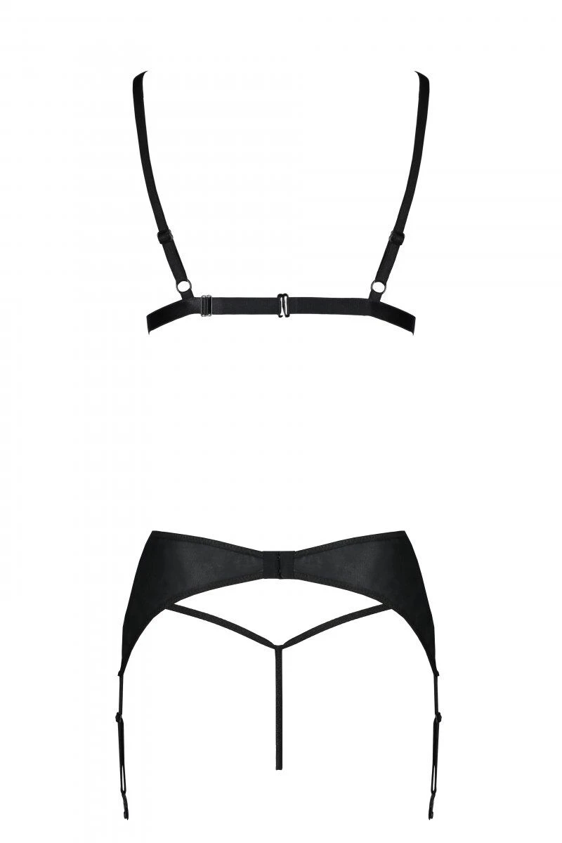 Комплект з екошкіри: трусики та бюстгальтер із вирізами, пояс для панчіх Miley Set with Open Bra black XXL/XXXL — Passion:
