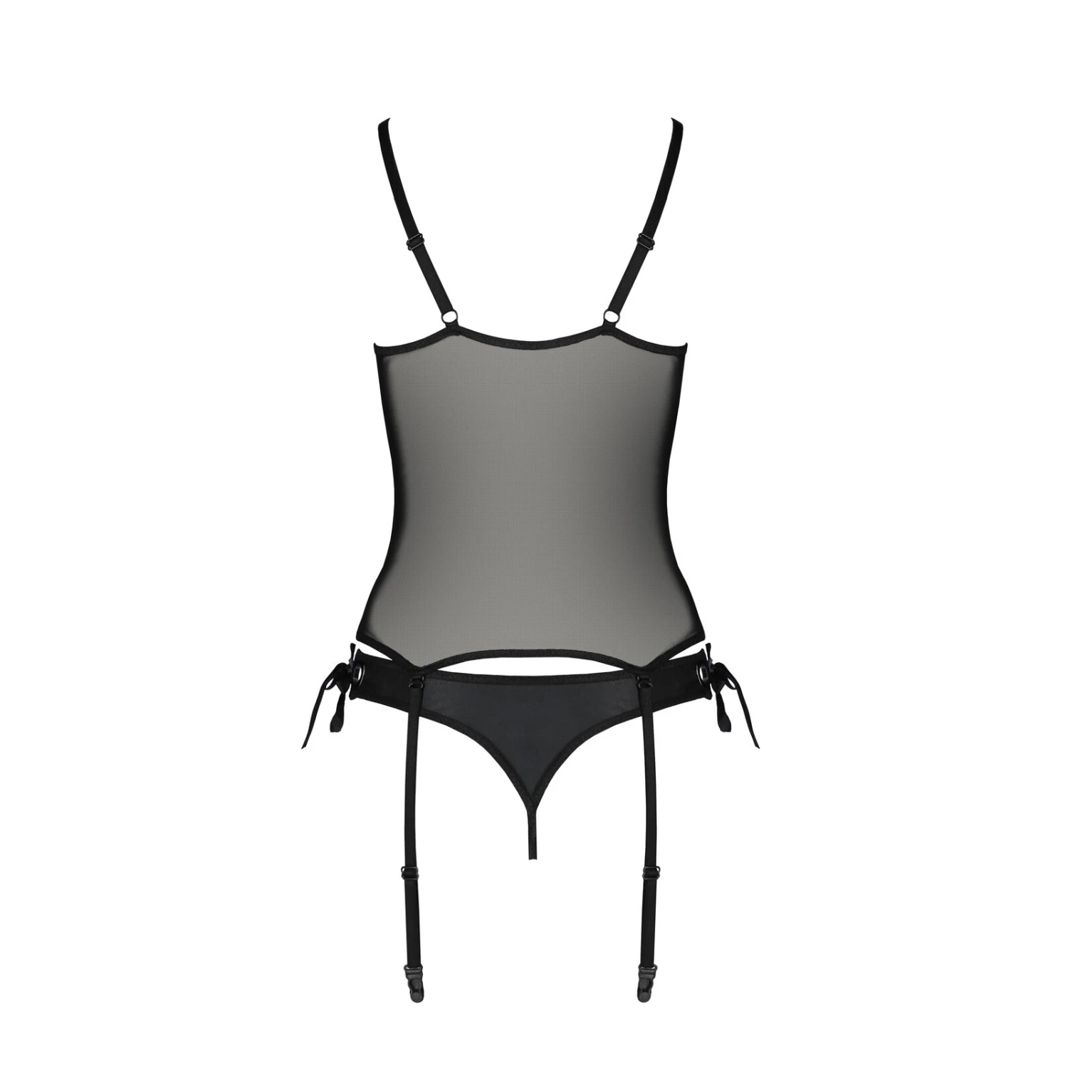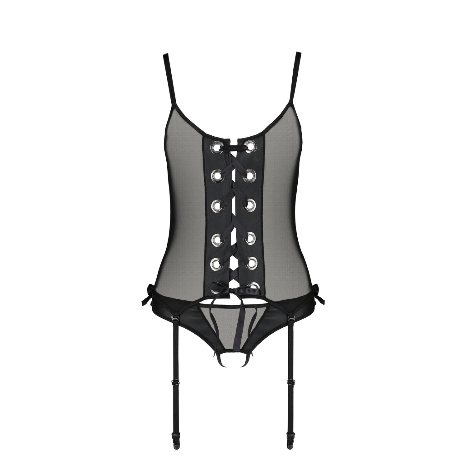 Трусики мають відкритий доступ до інтимних місць, пошитий з екошкіри з прозорими вставками. Стрінги мають з обох боків зав’язки, що дасть змогу регулювати розмір білизни. Також увага акцентована на зав’язках корсета, тому ваш образ вийде пікантним і зухвалим. Витонченість та тонкість натури жінки підкреслюють акуратні бантики. Виріз корсета глибокий, що візуально подовжить вашу шию і притягне погляд чоловіка до зони декольте. Прозора сіточка доповнена елементами зі шкіри, тому встояти перед таким вбранням просто неможливо. Якщо ви бажаєте підкреслити свою сексуальність, цей корсет Passion NESSY CORSET обов’язково допоможе досягти ефективних результатів.