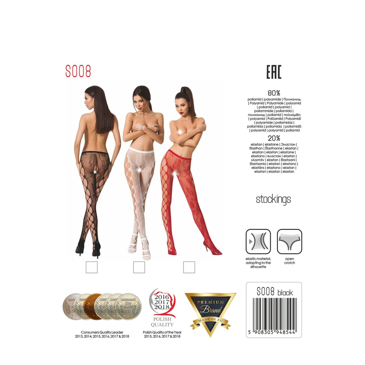 Еротичні колготки-бодістокінг Passion S008 white завдяки високій посадці візуально подовжують ніжки й роблять фігуру стрункішою. Ефектний візерунок у вигляді троянд на дрібній сітці плавно вплітається в дуже велику сітку збоку і створює дуже цікавий рослинний орнамент. Еластична резинка-пояс не передавлює тіло, що дає змогу одягати колготки під обтислу сукню або спідницю. Відвертий дизайн відкриє доступ до найінтимніших місць і стане пустотливим провісником пікантних ігор.