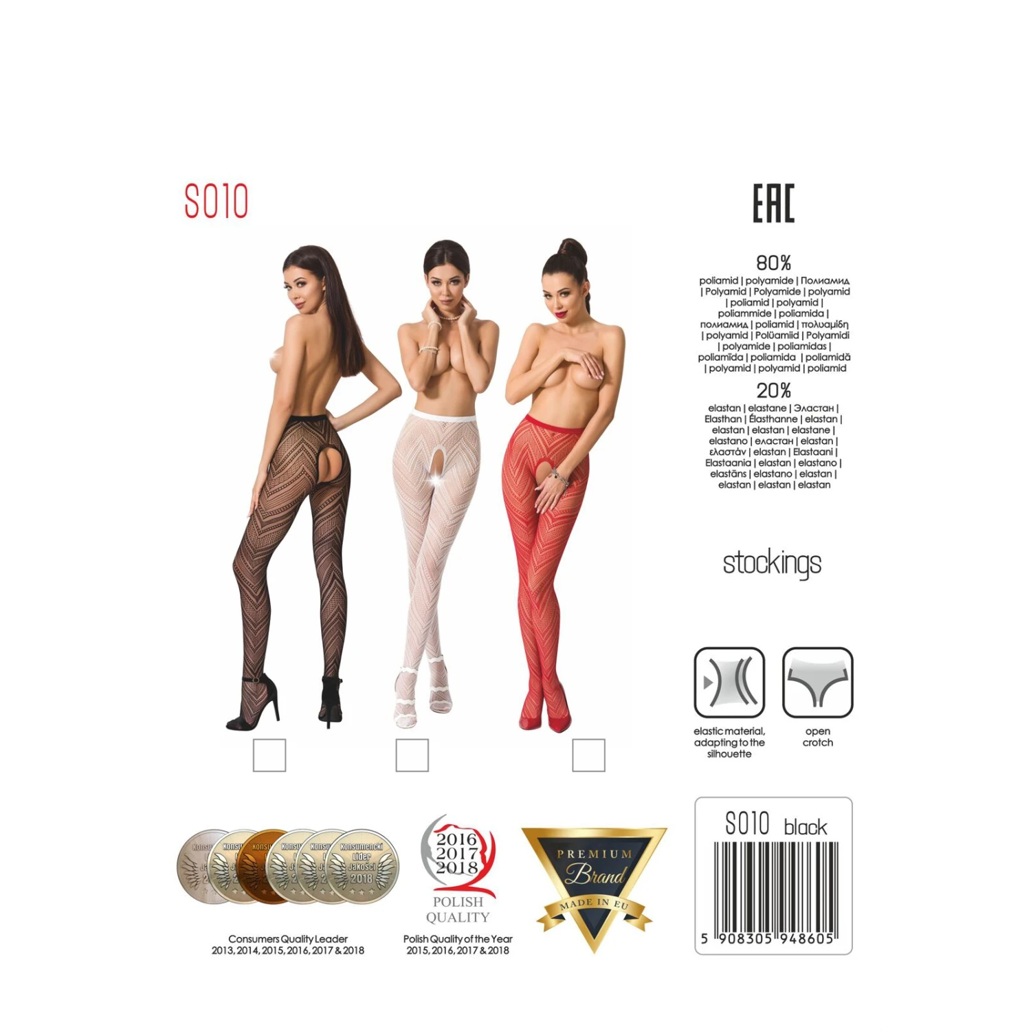 Еротичні колготки-бодістокінг Passion S010 white завдяки високій посадці візуально подовжують ніжки й роблять фігуру стрункішою. Незвичайне, досить щільне плетіння колготок утворює східний орнамент із кутами, спрямованими вниз. Таке плетіння слугує не тільки прикрасою, але й допоможе приховати наявні недоліки. Еластична резинка-пояс не передавлює тіло, що дає змогу одягати колготки під обтислу сукню або спідницю. Відвертий дизайн відкриє доступ до найінтимніших місць і стане пустотливим провісником пікантних ігор.