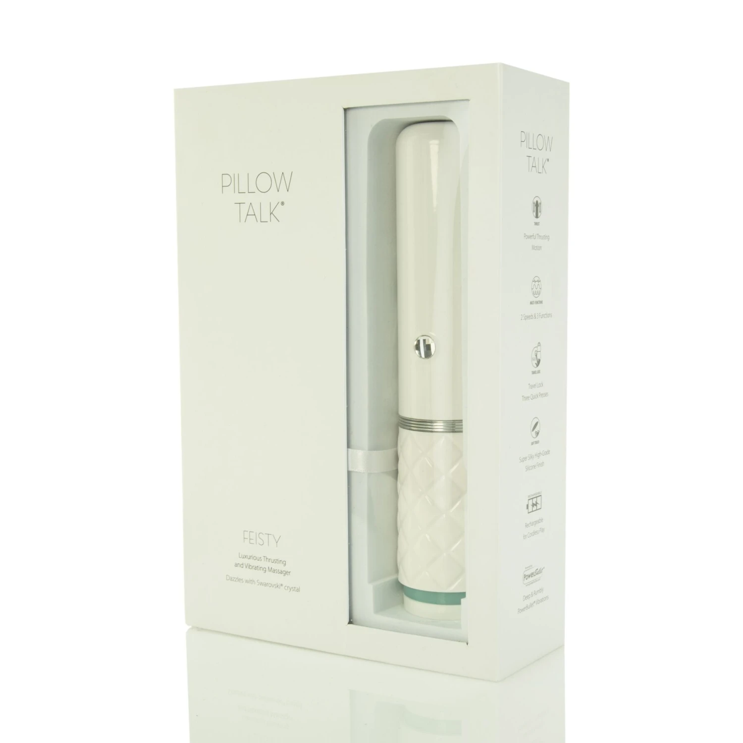 - Чудовий дизайн. Pillow Talk Feisty Thrusting Vibrator був розроблений, аби дарувати задоволення не тільки ерогенним зонам, але і радувати візуально. Такий ось естетичний оргазм як приємний бонус. Гладкий корпус, рельєфна рукоятка і вишенька на торті — кристал Swarovski. Все це доповнює світлодіодне підсвічування в теплому відтінку в колір вібратора пульсатора.