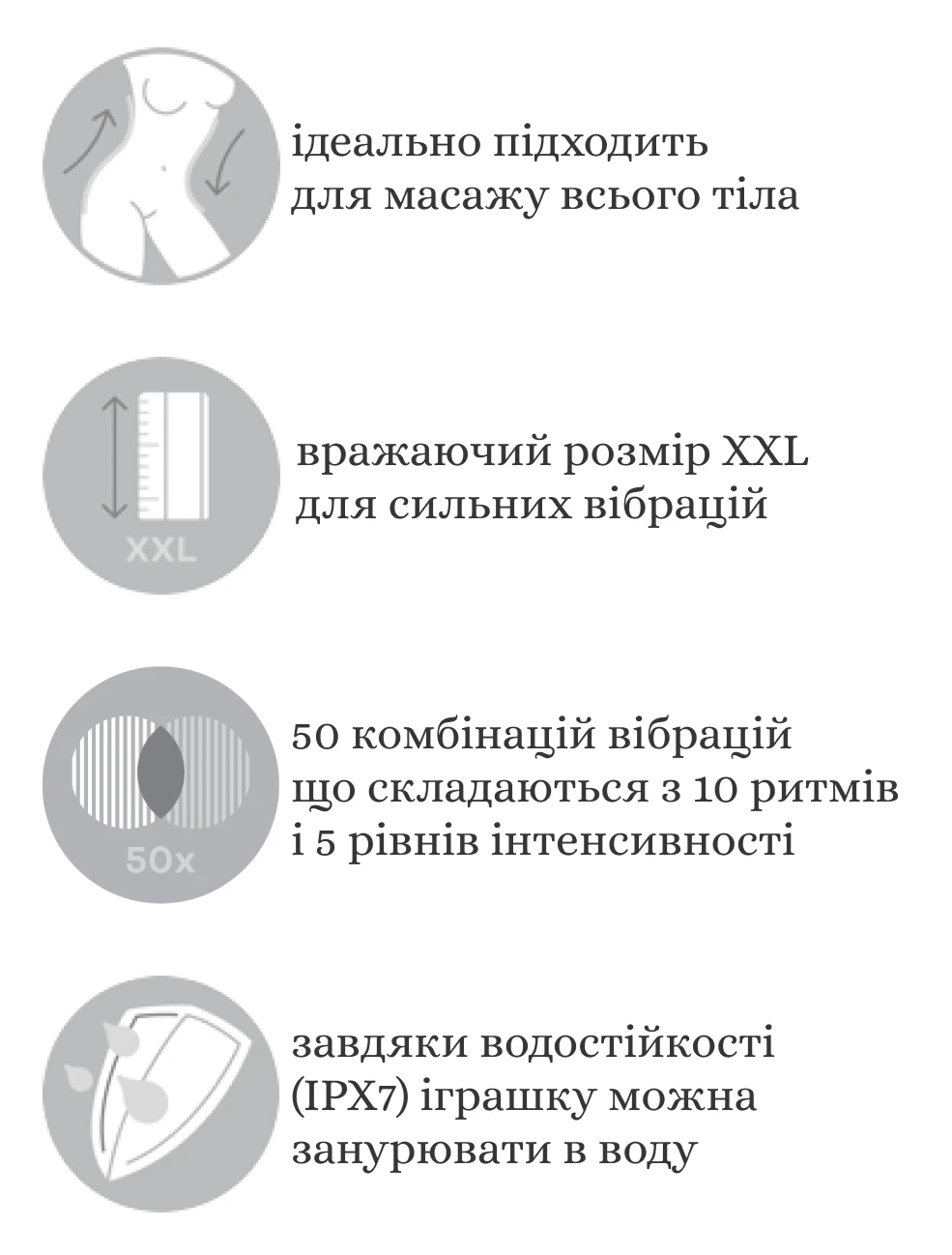 Голівка вібратора покрита найм'якшим медичним силіконом, це найбезпечніший матеріал для шкіри і слизової, не викликає роздратування і натертостей. Матеріал добре поєднується з лубрикантом на водній основі. Усередині голівки розміщений чудовий і дуже потужний мотор, який забезпечує аж 50 різних вібро комбінацій. Цілих 10 патернів вібрації і 5 рівнів інтенсивності, ви точно знайдете собі кілька улюблених комбінацій, але рекомендуємо щоразу вивчати їх заново, адже кожне поєднання просто неймовірно приємне.