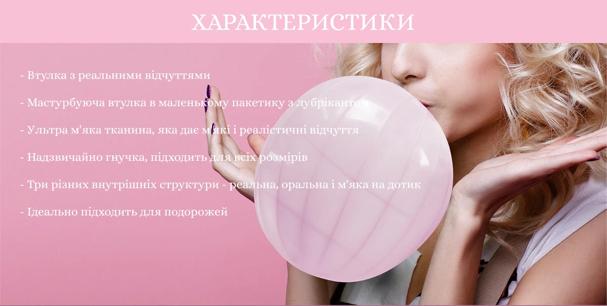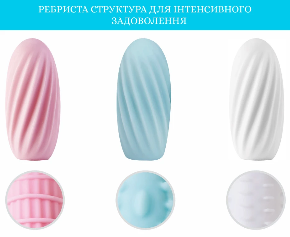 Були розроблені 3 різні структури. Синій Real Deal пропонує чудову вагинальную імітацію. Білий Vanilla Love має безліч м'яких вузликів, які пропонують декілька солодких сюрпризів. Рожевий Blow Job з круглим обідком створює відчуття всмоктування, як при приємному мінеті.