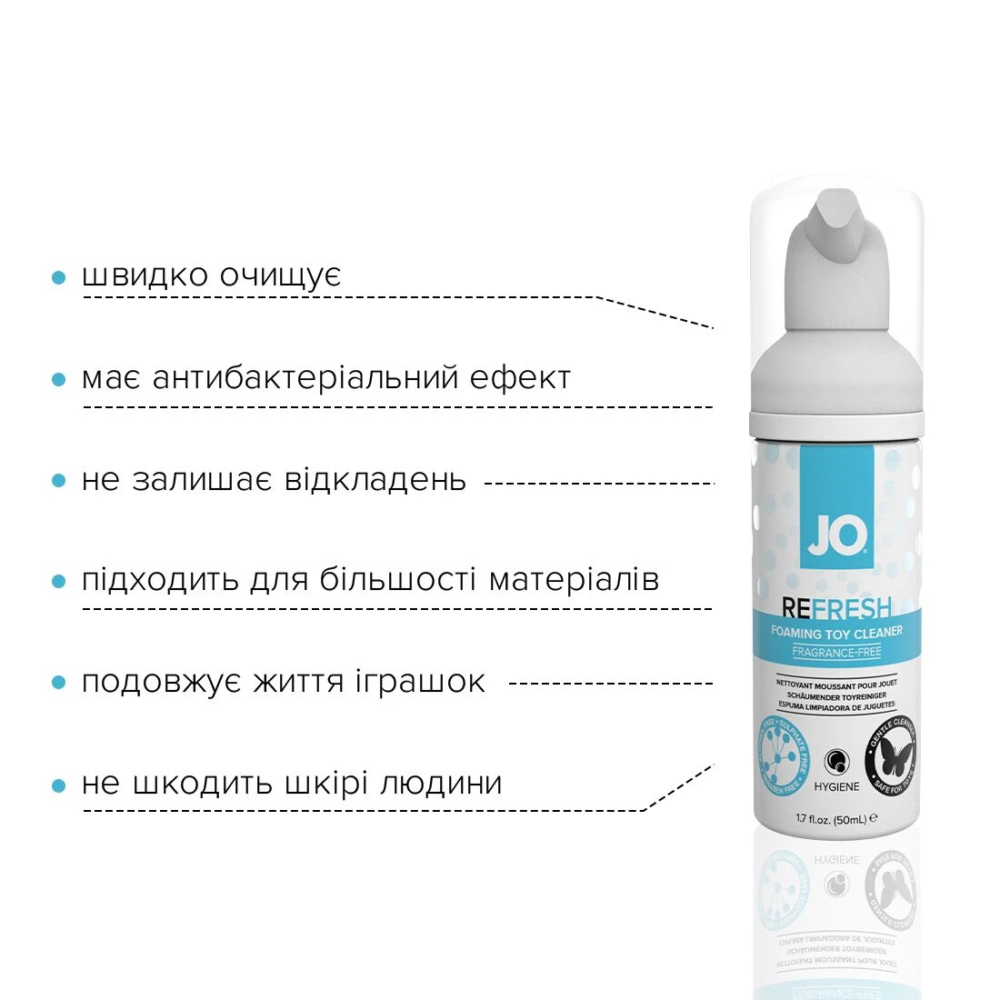 М’яка пінка для очищення іграшок System JO REFRESH — це ніжна турбота за допомогою пінного очищувального засобу для секс-іграшок JO® REFRESH. М’яка формула характеризується швидкістю очищення й не залишає відкладень. Відсутність триклозану та парабенів робить засіб безпечним для матеріалів будь-яких іграшок, а також для рук під час використання. Достатньо нанести шар піни на іграшку й залишити на 5–10 секунд, а потім змити. У разі сильних забруднень необхідно втирати засіб ретельніше.