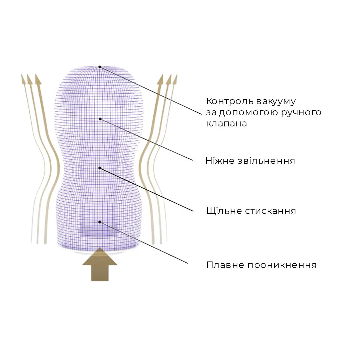 - Зовнішній отвір має «лопаті», які при проникненні члена блокують вихід повітря з внутрішньої частини іграшки;