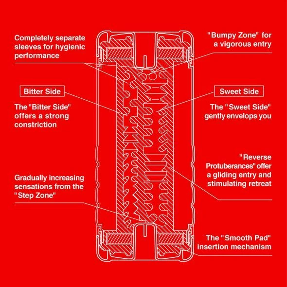 С одной стороны вход более широкий, напоминающий женское влагалище, внутри которого находятся 73 мягких выступа, нежно стимулирующих ствол и головку при каждом толчке.