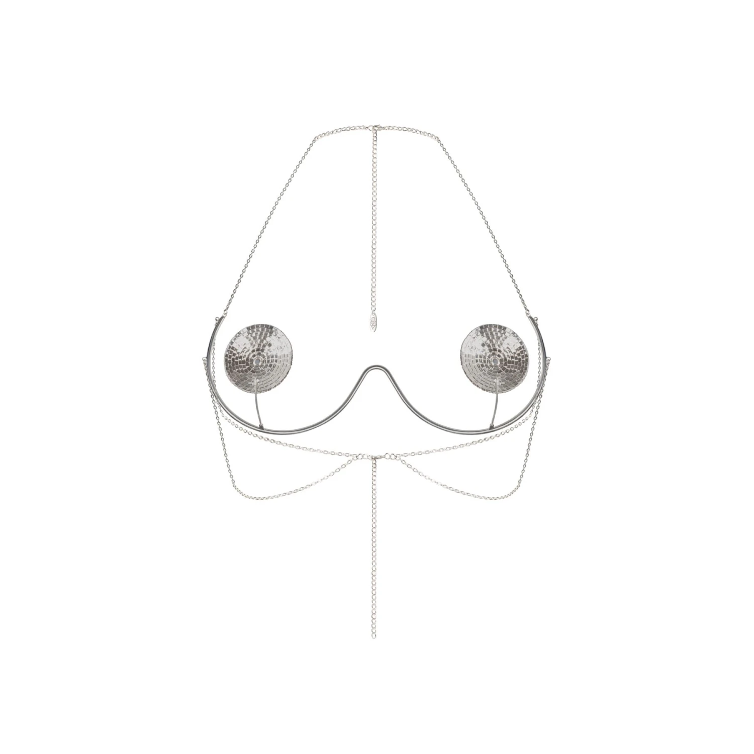 Основа украшения — жёсткий серебристый каркас, повторяющий контур под грудью и имитирующий косточки бюстгальтера. Главный элемент — круглые накладки на соски с зеркальной текстурой из множества мелких деталей, создающих эффект диско-шара. При любом движении или освещении они сияют и играют бликами.
