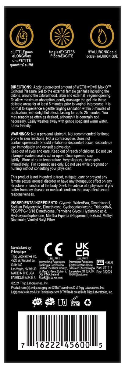 Комплексная работа действующих веществ создает невероятный возбуждающий эффект. Для повышения интенсивности добавьте стимуляцию трением. Возбуждающий гель для клитора Wet Wow Max O Clitoral Arousal Gel начинает работать через 30–120 секунд после нанесения (в зависимости от индивидуальной чувствительности).