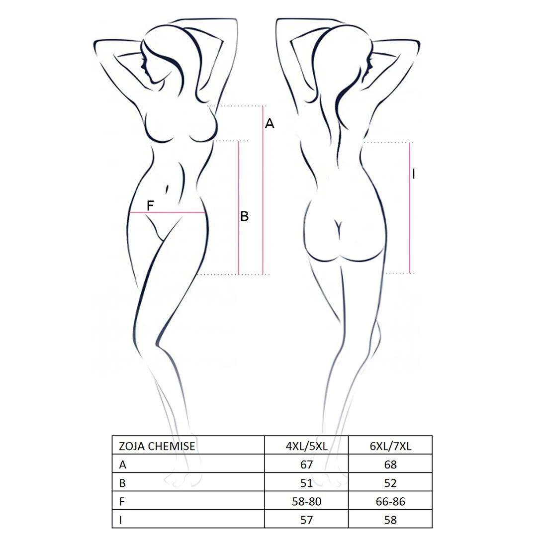 Эротическая сорочка большого размера Passion Size Plus ZOJA CHEMICE идеально будет сидеть на Вас - мягкая и эластичная микрофибра идеально облегает тело, скрывая возможные «недостатки» фигуры. Ткань в своей фактуре имеет вертикальные полоски, которые вместе с клиновидным вырезом, отделанным кружевом, создают невероятно стройный образ. Элегантное итальянское кружево создает эффект прикрытой наготы, невероятно возбуждая мужчину.
